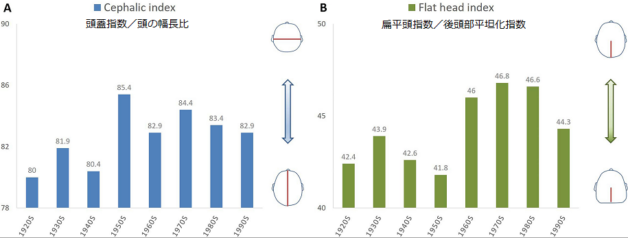 1950年以降生まれの人では、頭が全体的に丸く、前後が短くなる傾向(短頭)が見られました。